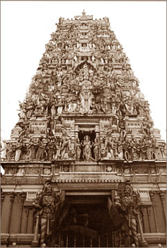 There are countless reasons why tourists visit Sri Lanka the tropical weather, the golden beaches, or the spectacular sights. While the areas of Colombo 1 and 2 remain the hub of tourist life with the many grandiose hotels some tourists may simply be content enough enjoying these luxuries. However, there are others who crave adventure and have the urge to explore the foreign land. Many tourists travel to the major sights that this small island has to offer, sights such as Adam's Peak, the various holiday resorts down south the mystical towns such as Kandy or Anuradhapura and much more. However, many tourists fail to realise or the Sri Lankan people simply fail to inform foreigners of the various fascinating places nearby. These days however, one small location is never missed by tour guides, and is popular among not only the local people, but also the foreigners. Now let's travail to the other side of town. No, let's just go down the street a couple of miles from Colombo's five-star hotels to view an wonderful sight at the corner of Kew Road and Śrī Murugan Street at Slave Island. Just as you turn on to Śrī Murugan Street, you will immediately look up and gape in utter astonishment at the sight. A tower made up of intricate carvings of small statues rises high a height of about 80 feet and looms over you as if to protect the sacred temple underneath This Hindu temple is known as the Arulmihu Sivasubramania Swami Kovil.