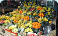 stalls selling garlands & platters of fruit-coconut, mango watermelon.
